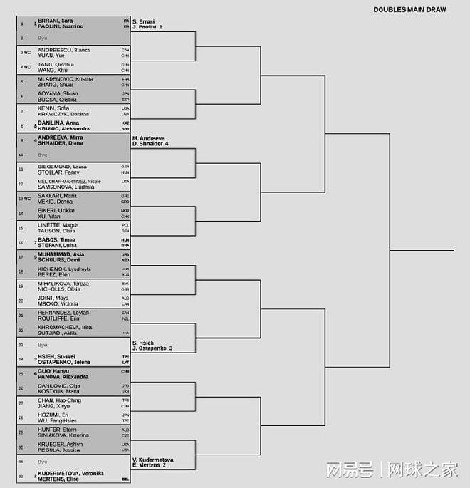 双打签表:安德莱斯库/袁悦 vs 汤千慧/王曦雨、张帅/穆拉德诺维奇 vs 青山修子/布克沙、徐一璠/艾克里 vs 萨卡里/维基奇、郭涵煜/帕诺娃 vs 达尼洛维奇/科斯秋克、蒋欣玗/詹皓晴 vs 穗积绘莉/吴芳娴。