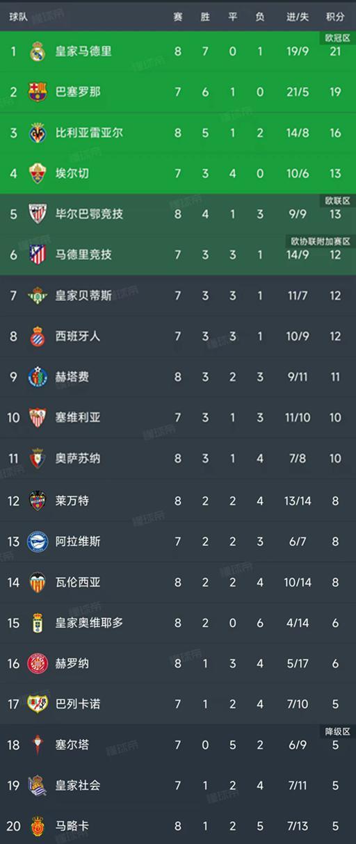 - 西甲 | 西甲第8轮结束了5场比赛,最新积分榜如下!