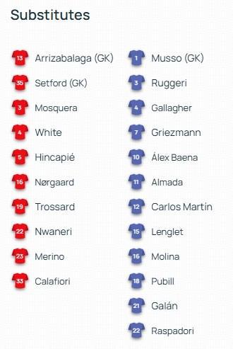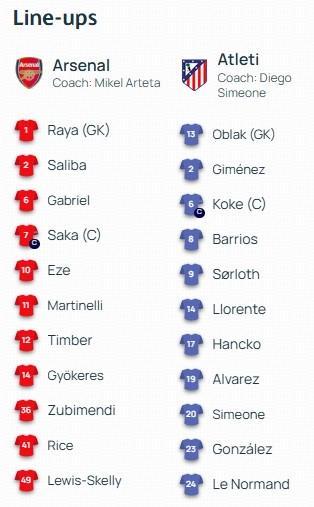 阿森纳首发:1-戴维-拉亚、2-萨利巴、6-加布里埃尔、7-萨卡、10-埃泽、11-马丁内利、12-廷贝尔、14-哲凯赖什、36-苏比门迪、41-赖斯、49-刘易斯-斯凯利马竞首发:13-奥布拉克、2-希门尼斯、6-科克、8-巴里奥斯、9-瑟洛特、14-马科斯-略伦特、17-汉茨科、19-阿尔瓦雷斯、20-朱利亚诺-西蒙尼、23-尼古拉斯-冈萨雷斯、24-勒诺尔芒