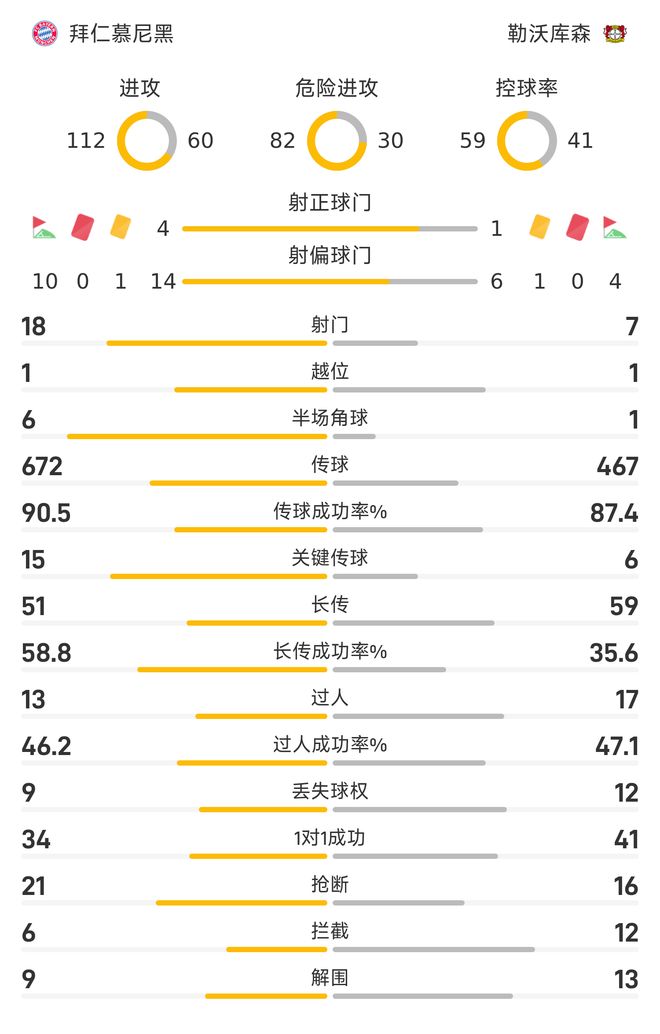 雷速体育11月2日讯 德甲第9轮,拜仁慕尼黑主场以3-0大胜勒沃库森。整场比赛里,拜仁在数据方面呈现着压倒性的态势,获得胜利实至名归。这场比赛里,拜仁在射门方面,以18-7呈现遥遥领先的态势,其中在射正方面,拜仁以4-1占据优势,4射正便打进3球,南大王也展现出颇高的进攻效率。在控球率方面,拜仁则以59%-41%明显超出对手。在传球次数上,拜仁以672-467处于领先态势;在传球成功率上,拜仁以90.5%-87.4%占据优势。在关键传球方面,拜仁以15-6则依然处于占优的位置。在过人方面,勒沃库森以17-13占优;在过人成功率方面,勒沃库森以47.1%-46.2%稍稍占优,这也是勒沃库森少有在进攻端的能够压倒拜仁的数据。技术统计