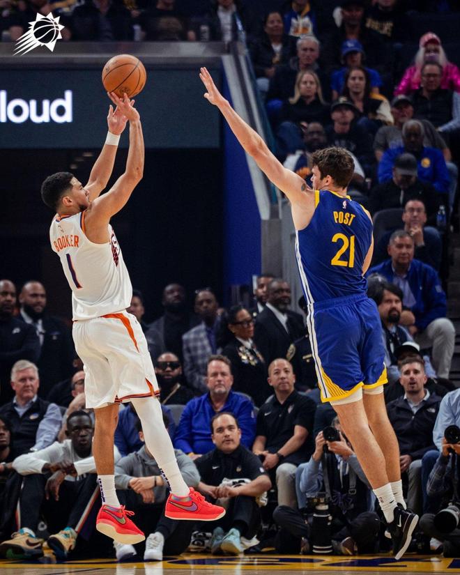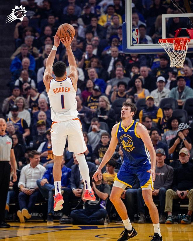 波杰姆斯基与布克在禁区斗法,布克2罚全中,邓恩反击上篮打进,库里、布克各有2罚全中。利弗斯劈扣,布克轰进三分球,科尔请求暂停。伊戈达罗送出大帽,奥尼尔外线取分,太阳将分差缩小至个位数。斯潘塞外线命中,为勇士止血,布克打板得分。穆迪2罚1中,布克跳投取分,库明加失误。第3节打完,勇士以92比83领先,太阳单节以34比24领先。布克单节17分,库里11分。末节决战,伊戈达罗抛投得分,穆迪命中三分球还以颜色,库里上篮打进,穆迪2罚全中,勇士稳住局面。阿伦轰进远投,波杰姆斯基连投带罚独得5分予以回应。穆迪又中三分球,太阳请求暂停。阿伦与波斯特对射三分球,布克单打命中,邓恩外线得手,马克威廉姆斯2罚全中,阿伦又中远投,分差再次被缩小至个位数,菲尼克斯看到了逆转取胜的希望。布克单打库明加