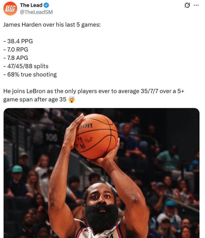 并且哈登这样的表现并非是昙花一现,而是其开季至今傲人表现的缩影,开季至今场均轰下28.4分,是哈登2020年在火箭队拿下得分王后场均得分新高。在小卡持续因伤缺席,比尔又赛季报销后,单核率领快船队的哈登进一步暴走,过去5场比赛场均轰下38.4分,合计5场比赛拿到192分,此前NBA历史上从没有球员能够在36岁之后连续5场交出这样的表现。此前保持类似纪录的球员是詹姆斯,他曾连续5场场均38分,总计拿到190分。
