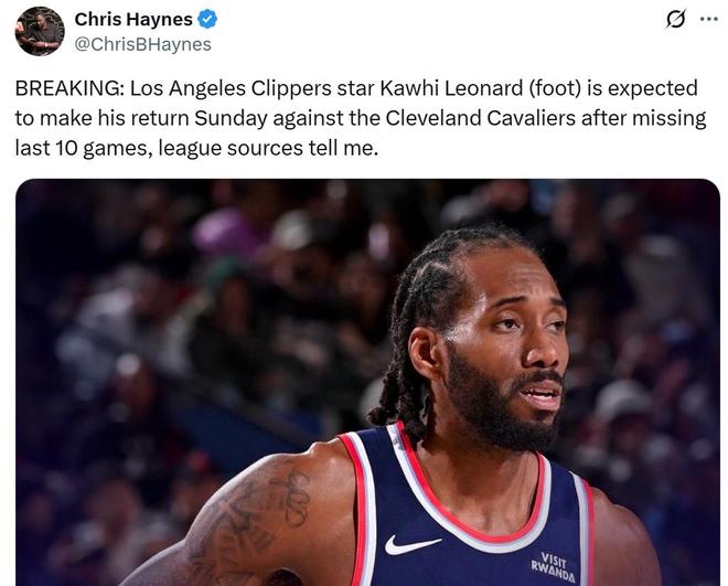 小卡敲定回归日期在哈登爆砍55分带队取胜结束连败之际,名记Haynes也送来好消息,已经因伤连续缺席10场比赛的小卡预计将在周一对阵骑士的比赛中复出。对于36岁的哈登和内外交困的快船队来说,没有什么是比小卡即将复出更好的消息了。