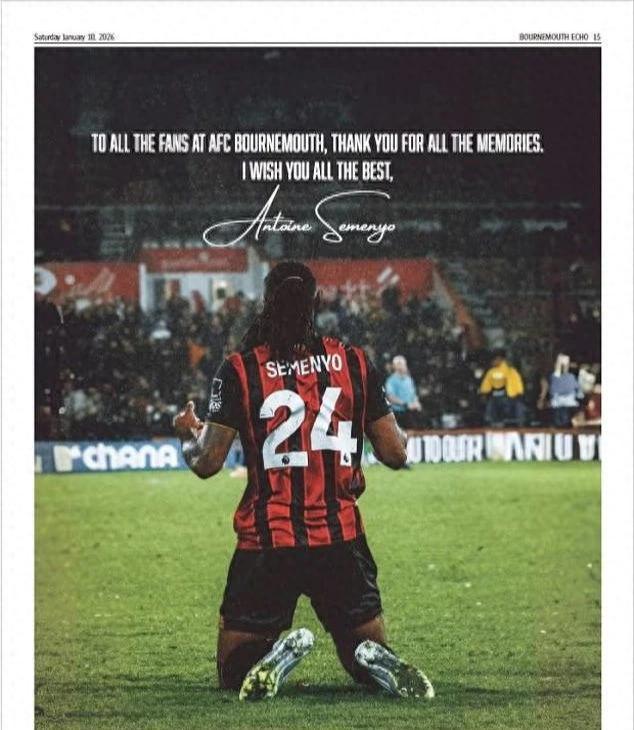 塞梅尼奥6250万英镑转会曼城,买下整版报纸致谢伯恩茅斯球迷